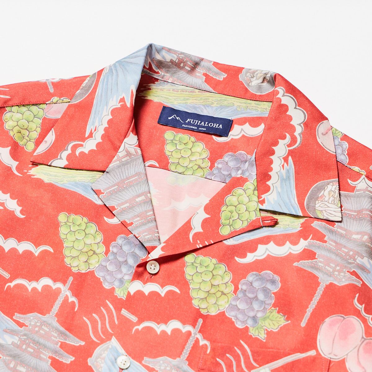 富士山、忠霊塔、ほうとう、ぶどう、桃──富士吉田を象徴する名物を散りばめた総柄のアロハシャツ。 ヴィンテージアロハシャツを思わせる、どこか懐かしいレトロなタッチで仕上げた一着。