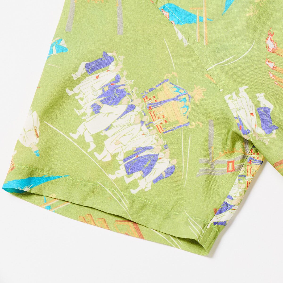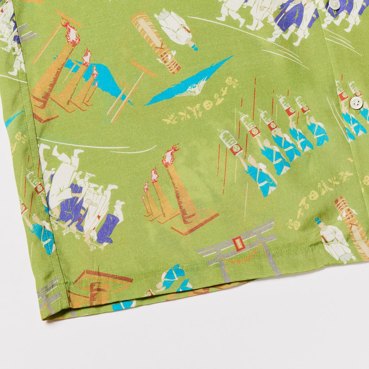 炎を上げる大松明、神主、神輿、神社──祭りの情景を散りばめた柄をプリントした、力強い一着。